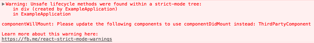 Saat mode ketat diaktifkan, React mengompilasi daftar semua komponen kelas yang menggunakan unsafe lifecycle dan mencatatkan pesan peringatan dengan informasi tentang komponen tersebut, misalnya: